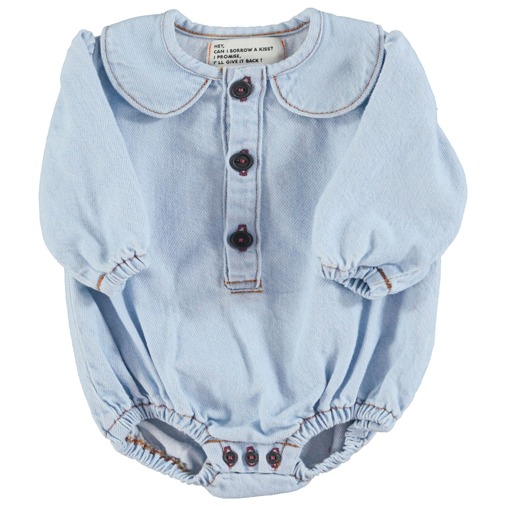 Baby long sleeve romper with ruffled collar. Buttons on the front. Elasticated cuffs. Elastic ribbed at thighs. Fasteners between legs. Detailed with leather logo on the back.