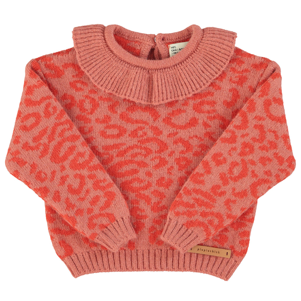 Knitted sweater with rounded frilled collar and detailed with leather logo label. Button on the back.