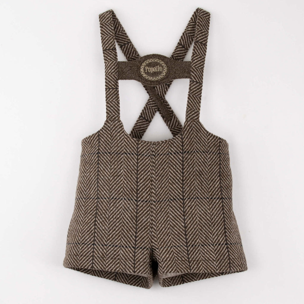 Popelin Brown Herringbone Woollen Short Dungarees With Embroidery Applique