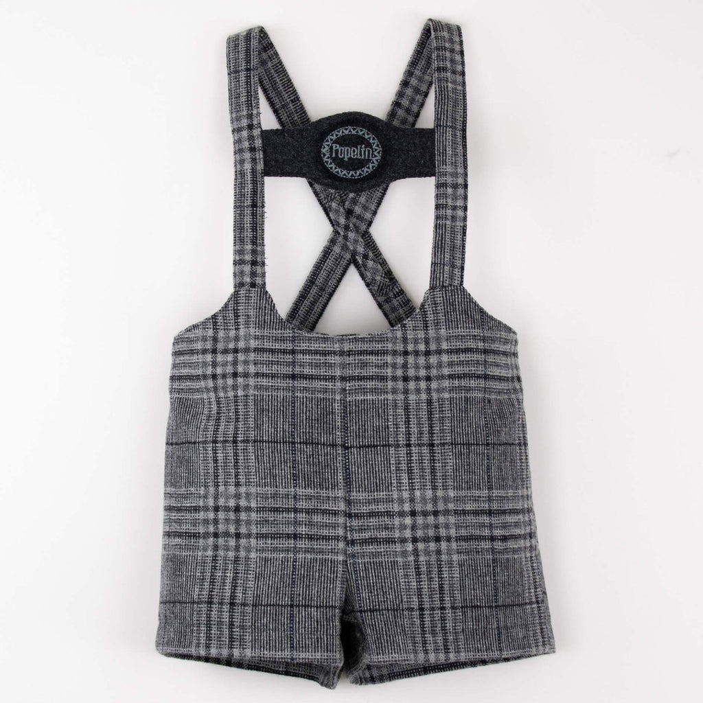 Popelin Grey Plaid Woollen Short Dungarees With Embroidery Applique